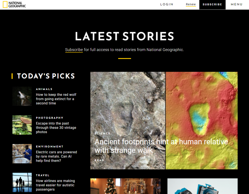 Create a webpage that replicates the UX / UI design of the landing page for National Geographic using: